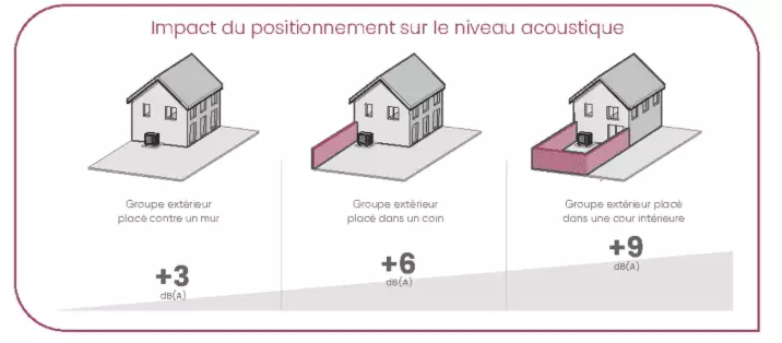 Le positionnement de l’unité extérieure est très important et peut influencer la réverbération du bruit dans votre extérieur. L’emplacement de l’unité extérieure doit donc être le moins confiné possible, plus il y a de surfaces autour de l’unité extérieure (murs, clôtures, vitrages, etc), plus elle sera bruyante. L’idéal étant de multiplier les directions de propagation des ondes sonores.