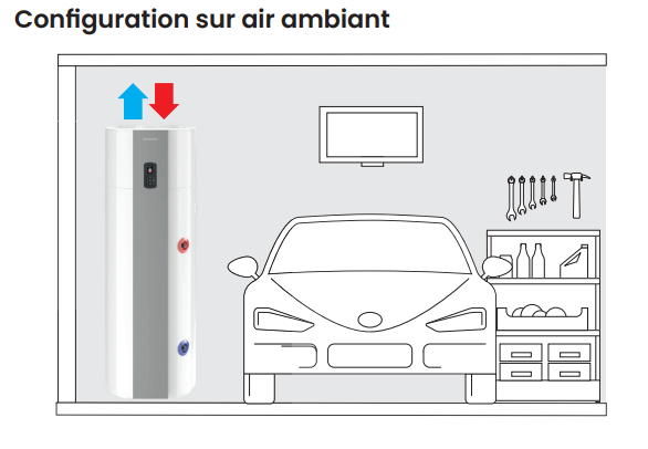 C’est la configuration la plus “simple”. Le chauffe-eau récupère les calories de la pièce dans laquelle il est installé : garage, buanderie, cave… cette pièce doit être non chauffée, hors gel (t° supérieure à 5°C) et avoir un volume d’au moins 20m3 hors encombrement.