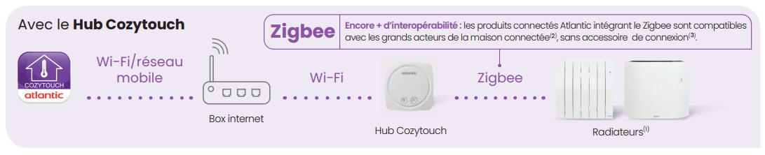 (2) Le Zigbee est un protocole international de communication IoT. (3) Les produits connectés Atlantic sont également compatibles sur les fonctionnalités principales de pilotage et de suivi de la consommation : pilotage à distance, réglage et visualisation de la température, détection de présence, off, suivi de consommation