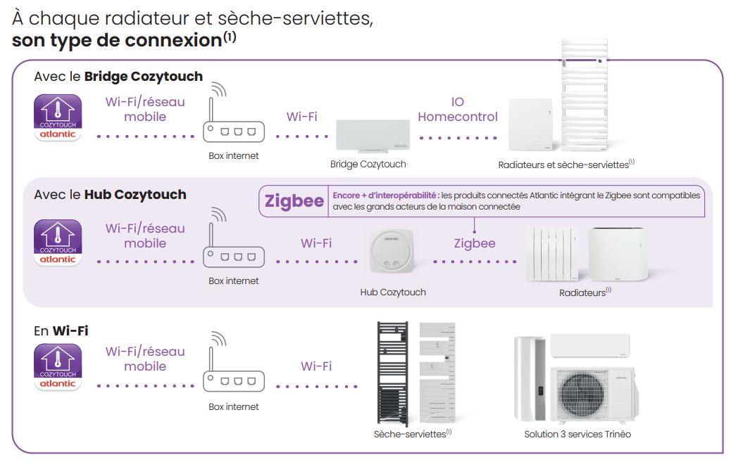 Le protocole IO Home control, choisi pour sa robustesse, sa sécurité, et sa faible propagation des ondes. Le protocole IO Homecontrol est utilisé depuis 2005 et a déjà été déployé sur plusieurs millions d'appareils avec succès. Ce protocole est utilisé sur de nombreux produits Atlantic connectés, notamment les radiateurs et les sèche-serviettes. Ce protocole nécessite l’acquisition supplémentaire du bridge Cozytouch, qui relie les produits connectés à internet (1). Depuis 2021, le nouveau modèle de bridge Cozytouch peut fonctionner en Wifi avec votre box internet et n’a donc pas besoin d’être reliée à celle-ci par câble ethernet.